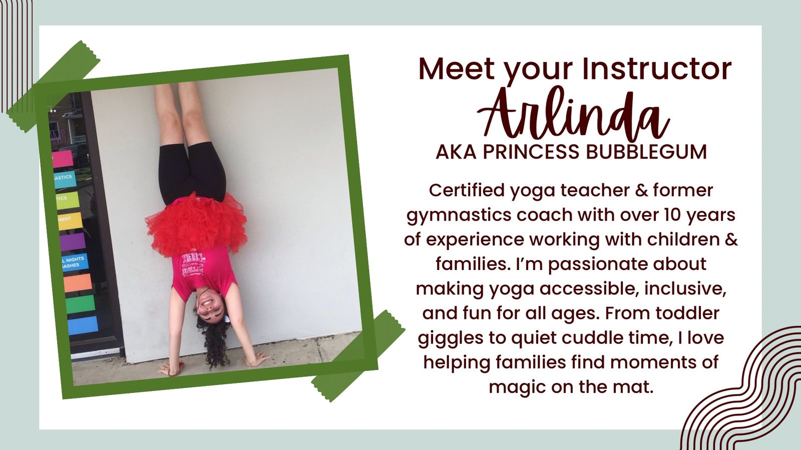 Instructor: Arlinda (aka Princess Bubblegum) – an experienced yoga teacher with over 7 years working with children and families through movement, mindfulness, and joy.